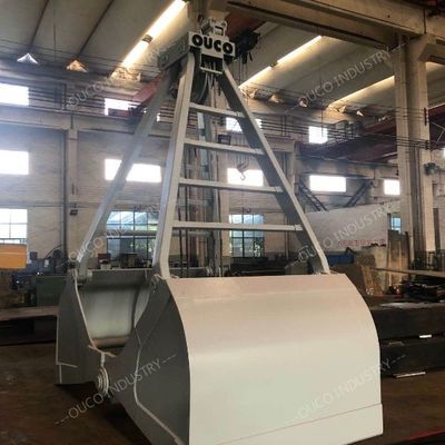 This mechanical clamshell grab is connected to the crane by two wire ropes, one holding rope and the other closing rope.